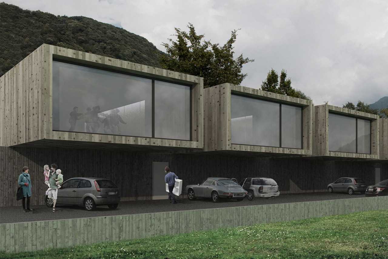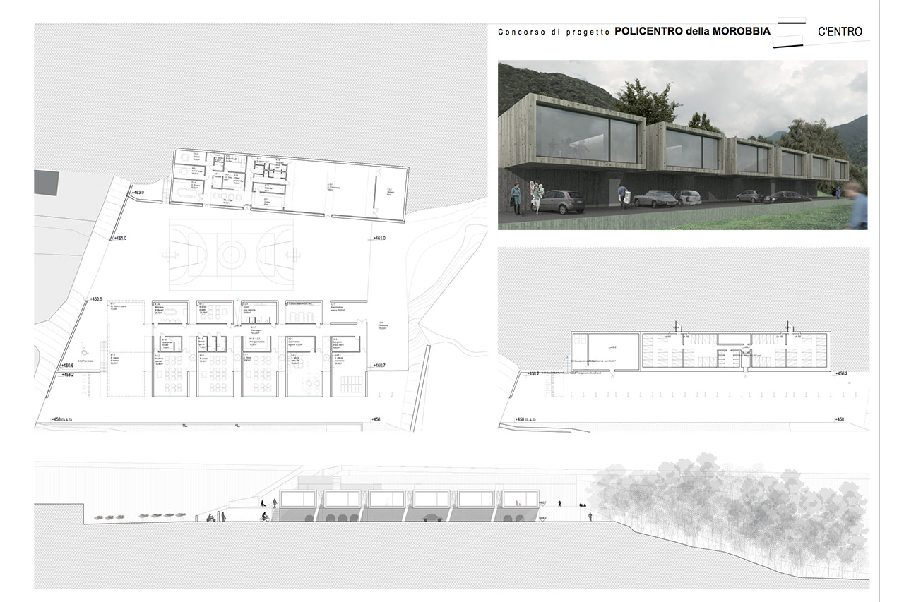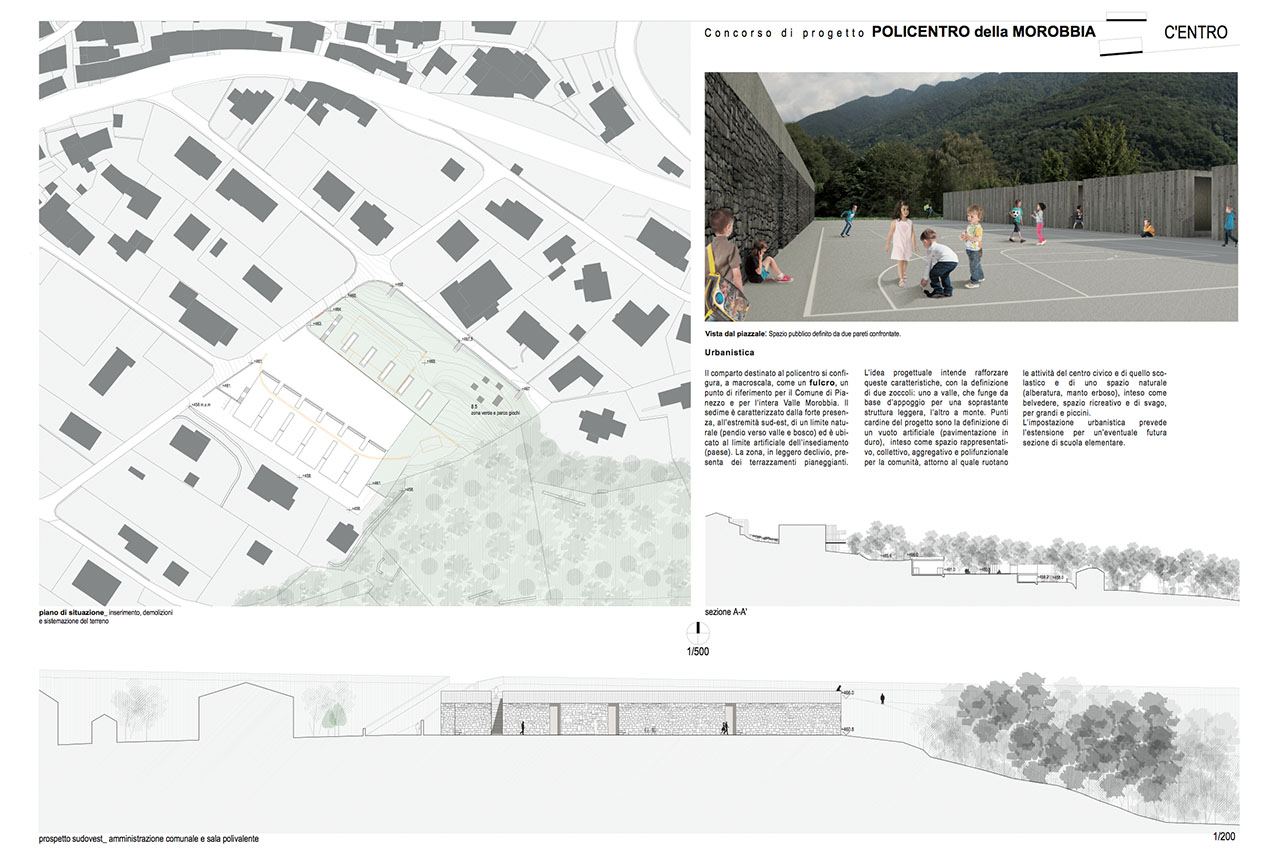 Il comparto si configura, a macroscala, come un fulcro, un punto di riferimento per il Comune e l’intera Valle Morobbia. Il sedime è caratterizzato dalla forte presenza, all’estremità sud-est, di un limite naturale (pendio verso valle e bosco) ed è ubicato al limite artificiale dell’insediamento (paese). La zona, in leggero declivio, presenta dei terrazzamenti pianeggianti. L’idea progettuale intende rafforzare queste caratteristiche, con la definizione di due zoccoli: uno a valle, che funge da base d’appoggio per una soprastante struttura leggera, l’altro a monte. Punti cardine del progetto sono la definizione di un vuoto artificiale (pavimentazione in duro), inteso come spazio rappresentativo, collettivo, aggregativo e polifunzionale per la comunità, attorno al quale ruotano le attività del centro civico e di quello scolastico e di uno spazio naturale (alberatura, manto erboso), inteso come belvedere, spazio ricreativo e di svago, per grandi e piccini.